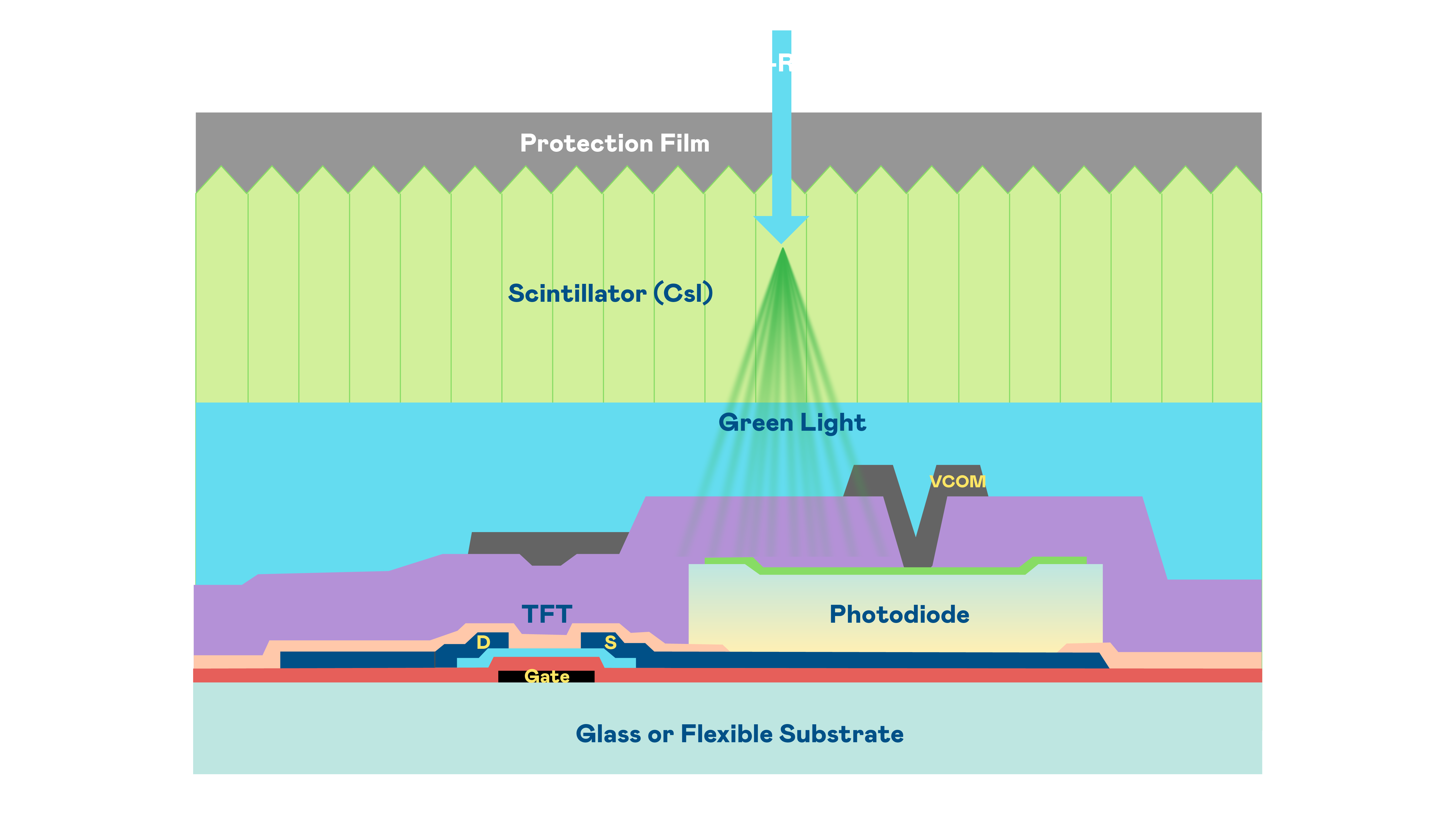 九游会的X光影像感測陣列使用薄膜電晶體 (TFT) 作為每個像素的讀取開關,搭配光電二極體(Photodiode)的光電轉換元件,用以感測X光影像訊號。